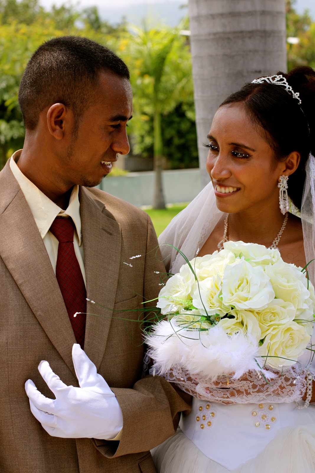 After class I headed out on a stroll to take pictures of the beautiful things I see when I run but obviously can't capture because I don't have a camera. In the park from a few posts back here, I happened upon a Timorese wedding. I have an affinity for weddings and the happiness they bring to everyone involved. It really is a triumph that everyone can enjoy- love conquering all. It gives us all hope- in everything! This beautiful couple were gracious enough to let me take their picture. I got their email and sent them this photo and some others. They must have been extremely hot in the suit, dress and gloves. Love doesn't care if it's 90 degrees and 85% humidity, I suppose.
