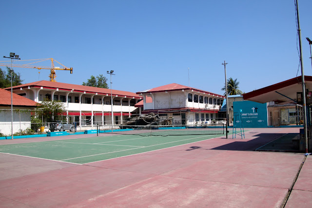If you look closely you can see in the far left corner of the court, there is a large greyish-brown banyan tree stump. I guess they can't really remove it easily because of where it is, so they have been burning it every few days or so for the last 2 months. It's great when its really blazing and the flames are actually through the fence and the white smoke is being blown onto the court (into my face). That is the side of the court I play on during my lesson so I can attest that poor/smokey air quality does in fact make it more difficult to run around a court.